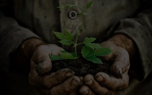Old man hands holding a green young plant. Symbol of spring and ecology concept